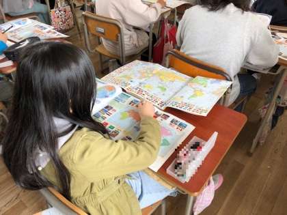 聞いたことのある国名が、国旗や場所と少しずつ結びついていくので、子どもたちは興味深く取り組んでいます。