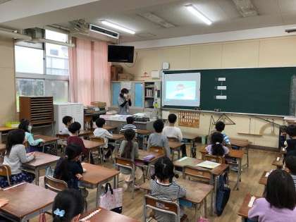 今朝は一年生にとってはじめてのイングリッシュタイムでした。