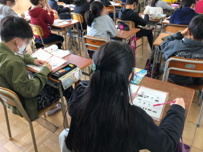 6年生の外国語の時間では、ヒアリングを行いました。英語で話される自己紹介を聞いて、その自己紹介はワークシートに記されている誰のことなのかを聞き取るものでした。子どもたちは流される音声を集中して聞いていました。