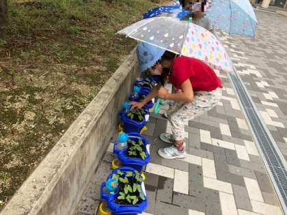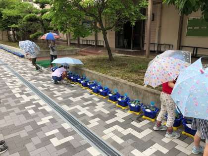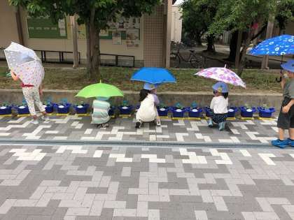 ここ数日の雨をいっぱい吸い込んで育ったアサガオを、子どもたちはいろいろな角度から見たり手で触ったりして、じっくりと観察していました。
