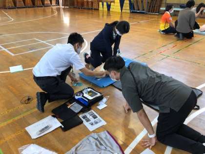 平野消防署からお借りした資材を使って、心肺蘇生法やAEDの使い方を実習しました。