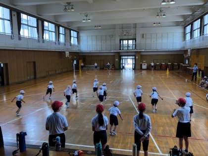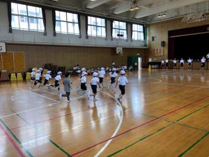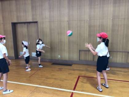 1年生児童はシャトルランが終わった後、6年生のお兄さんお姉さんたちとボールを使っての運動や交流を楽しく行いました。