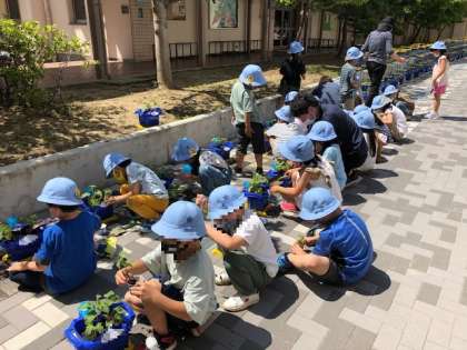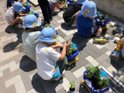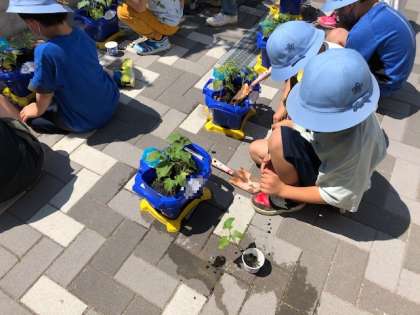 間引いた苗はヨーグルトのプラスチック容器に入れ、学習園の隅に植えたりしていました。