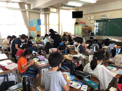 5年生の家庭科は裁縫で、“名前の縫い取り”をしています。