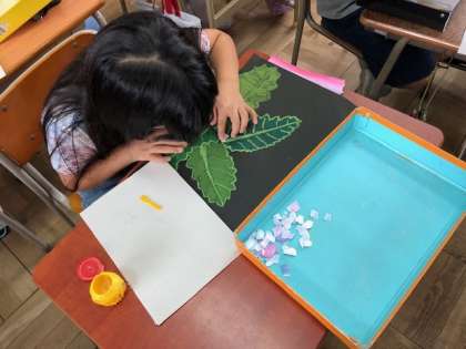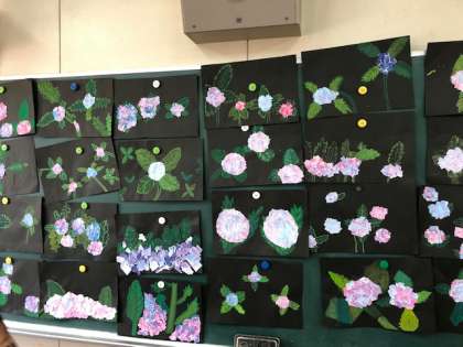 着色したアジサイ色の紙を手でちぎり、前の時間に描いた葉っぱの付近にのりで貼り付けました。それぞれアジサイの雰囲気が出てとても良い作品に仕上がりました。