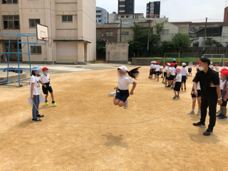 この記録会は、3分間で何回跳べるかチャレンジするものです。みんな一生けんめいにがんばり、クラスで決めた目標を達成したクラスからは拍手が起こっていました。
