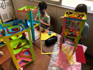 方眼の印刷された色とりどりの厚紙を加工し、ビー玉の動く道筋を考えながら、部品を適当な場所に貼りつけていきました。