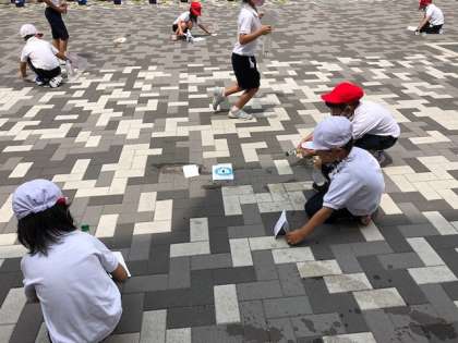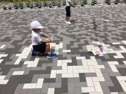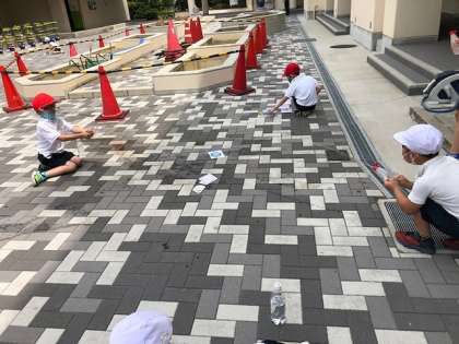 各自家から持ってきたペットボトル、マヨネーズの容器などのふたに穴をあけて水鉄砲を作りました。また、画用紙にパスで描いて的を作り、その的めがけて水をかけていました。