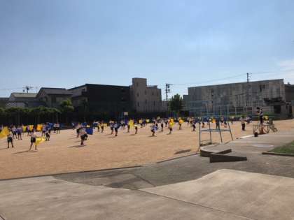 音楽を流し、朝礼台の上で演技をする先生の見本を見た後、子どもたちは少しずつ演技を進めていました。
