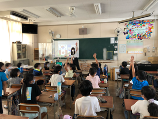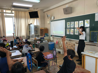 英語であいさつをした後、ミン先生の自己紹介や母国の紹介をクイズ形式で行いました。日本と違う乗り物や食べ物の写真を見て、子どもたちは興味津々の様子でした。