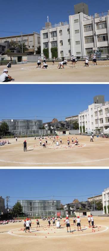 4年生と比べて1クラスの人数が少なくクラス数も多いため、円の中に入って玉を投げる子どもの数は減りますが、一人ひとりがかごをめがけて精一杯投げ込んでいました。