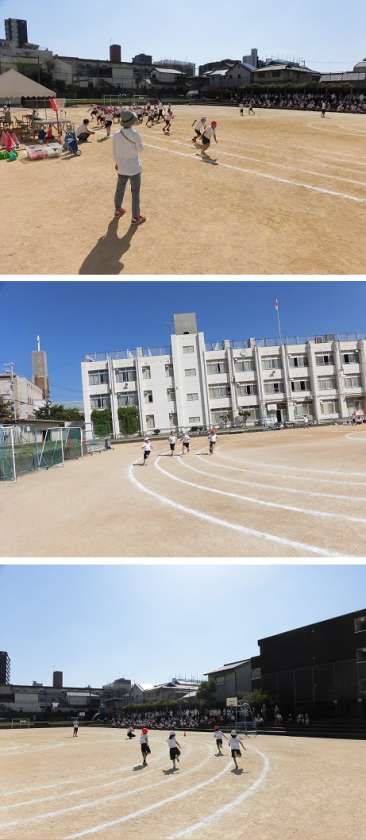 4人ないし3人一組になってスタートし、トラックの半周先のゴールを目指しました。