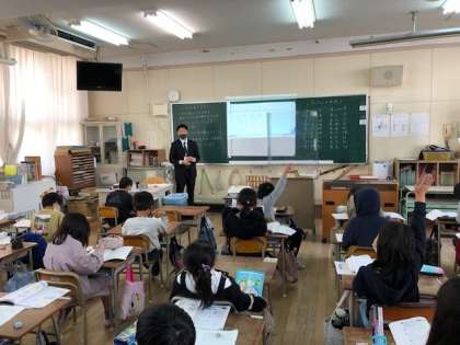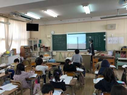 最初に、「かける数が1ふえると、答えがいくつふえるか」「かける数とかけられる数を入れかえる答えはどうなるか」などのかけ算の性質の確認をしました。かけ算の性質はこれまでのかけ算で学んできたので、子どもたちは思い出しながら次々に発表することができました。