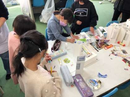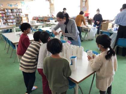 子どもたちは図書ボランティアの方の説明を、静かにじっと見ながら聞くと、急いで工作に取りかかりました。