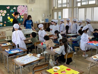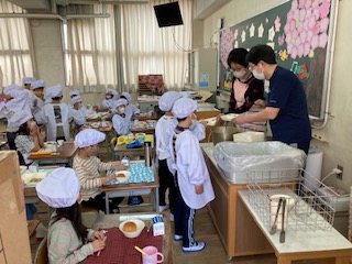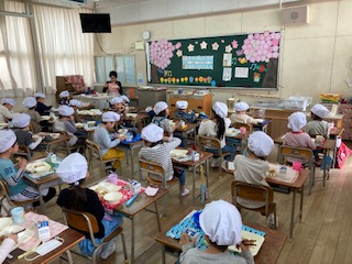 今日から給食があります。1年生にとって、小学校生活で初めての給食です。先生がおかずを食器に入れ、それを給食当番が配膳しました。美味しくいただきました。