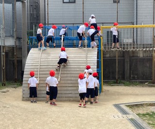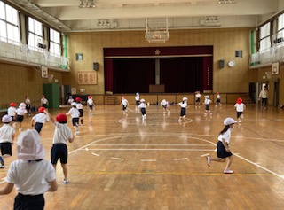 1年生が運動場と体育館にわかれて、体育の学習をしました。体育館では鬼遊びをしました。運動場では、遊具を使った運動をしました。