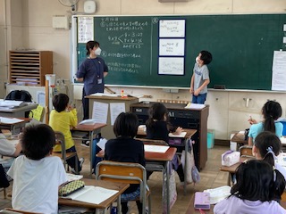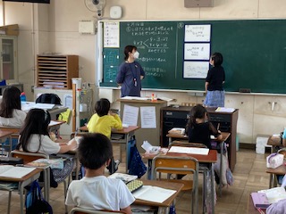 3年生が算数「9×7の求め方を説明しよう」を学習しました。かける数を分けて考えました。自分の考えをしっかりと発表できました。