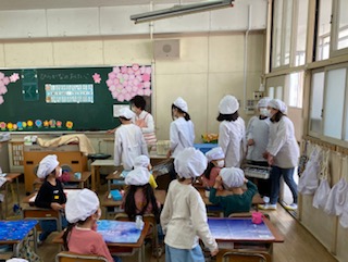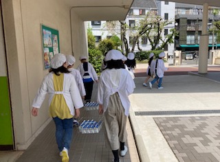 6年生が、3時間目終了後の休み時間に給食室から1年生の教室まで給食を運んでくれました。6年生ありがとう。