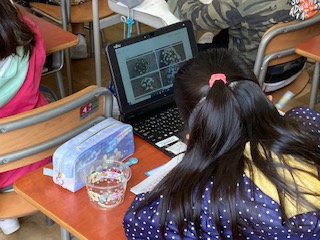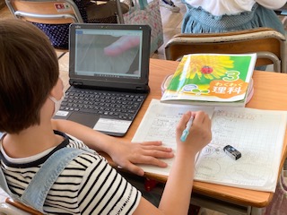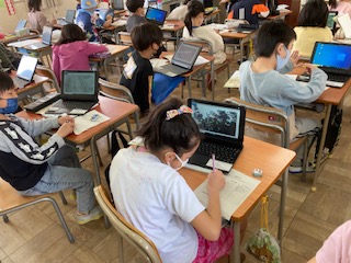 3年生が校内で春の生き物さがしをしました。見つけた植物や生き物をタブレットで撮影しました。今日は、撮影した写真を見ながら、見つけた生き物、見つけた場所、気がついたことを発見カードに書き入れました。
