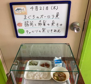 まぐろのオーロラ煮は子どもたちが好きな給食メニューのひとつです。しょうがは高知県産です。