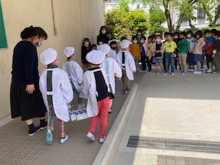 入学してからしばらくは、6年生が運んでくれた給食ですが、今では自分たちで教室まで運んでいます。運ぶ途中で「がんばれ」と、2年生が応援してくれました。