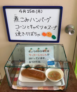 煮込みハンバーグは、子どもたちの人気メニューのひとつです。かぼちゃは、北海道産です。