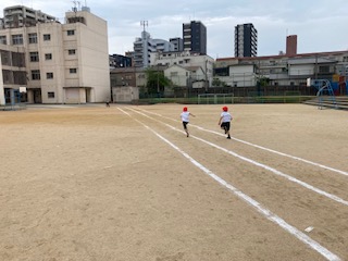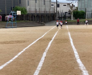 1年生が体力テストの50m走をしました。1年生にとっては、長い長い距離を、まっすぐ前を見て最後まで一生懸命に走りました。