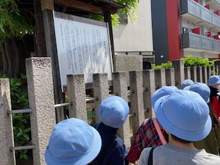 松虫中学校の横を通り、松虫通りを歩きました。そこで、「松虫」の意味がわかりました。松虫塚の伝説を先生から教えてもらいました。