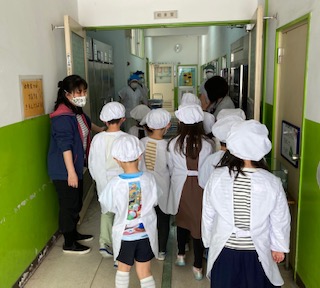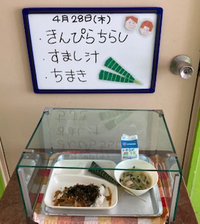 今日の給食は、子どもの日の行事献立です。ちまきに、子どもたちは大喜びです。給食調理員さんは、かぶとをかぶって給食運搬の支援をしてくれました。