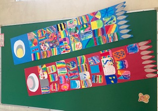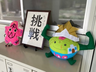 校内には、1年生が作成したこいのぼりが飾られています。また、本校のマスコットである「まるやマン」と「さくラン」が、かぶとをつけてお祝いしています。