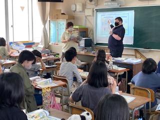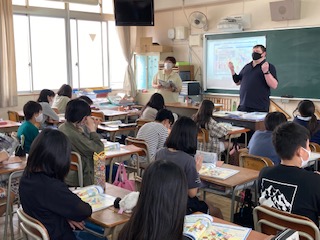 6年生がC-NETの先生と一緒に外国語(英語)の学習をしました。今日は、教室で使う英語を学びました。teenとtyの発音の聞き分けが難しかったです。
