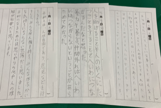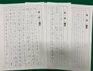 今日は、いじめについて考える日です。児童朝会では、校長先生が絵本「へいわってどんなこと」を読み聞かせしました。校長先生が、平和とはいのちが大切にされること、生きることはすてきなこと、いのちより優先されたり、大切にされたりするものは何もないと、お話されました。児童朝会終了後、6年生が感想文を書いてくれました。平和とはどんなことか、ひとりひとりがしっかりと考えました。