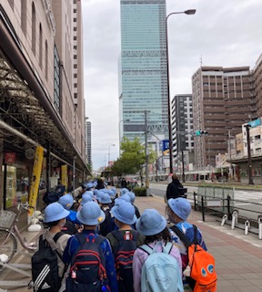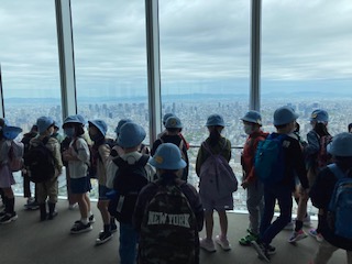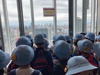 3年生が、学校から歩いてあべのハルカスへ行きました。あべのハルカスの展望台から大阪のまちを見るために行きました。60階の展望台まで行きました。