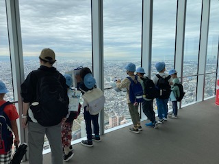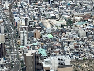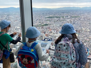 天王寺公園、大阪城、梅田のビル街、通天閣、大阪港、生駒山、淡路島などが見えました。また、丸山小学校を見つけることができました。