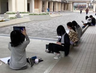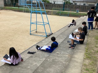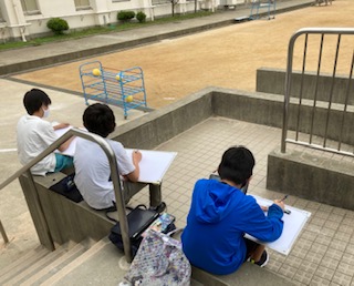 6年生が校舎の絵を描き始めてまし。遠近が表現できるように、構図を考えタブレット端末で撮影しました。細かなところはタブレット端末を見て描きました。できあがりが楽しみです。