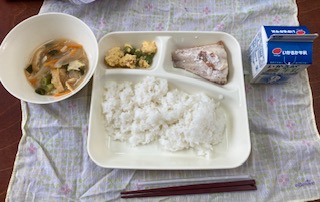 献立は、あかうおのしょうゆだれかけ、みそ汁、えんどうの卵とじ、ご飯、牛乳です。えんどうの卵とじのえんどうは、給食室で