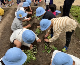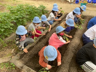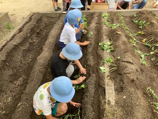2年生が、さつまいもの苗を学習園に植えました。いも掘りの経験がある児童はいますが、苗を植えた経験がありません。おそるおそる土を触り、植えていました。収穫が楽しみです。
