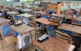 地震による避難訓練をしました。授業中に強い地震が発生したと想定して、安全な場所へ避難する訓練をしました。避難中は、押さない、走らない、泣かない、しゃべらないの「お・は・な・し」を守って落ち着いて行動しました。