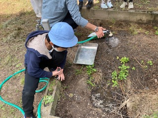 4年生が理科「地面を流れる水のゆくえ」を学習しています。教室で教科書を使って、観察のポイントなどを確認した後、学習園で水の流れを作り、ビー玉の流れを見ました。