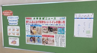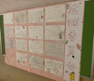 校内には掲示板がいくつかあります。学年掲示板では、児童の作品を掲示しています。保健室前の掲示板には保健のニュースなどを、委員会の掲示板には、委員会の紹介や取組などを掲示しています。