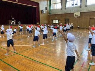 2年生が体育館で、運動会のダンスの練習しました。今日は2曲目のダンスを練習しました。リズムに合わせて、元気に楽しく踊っていました。