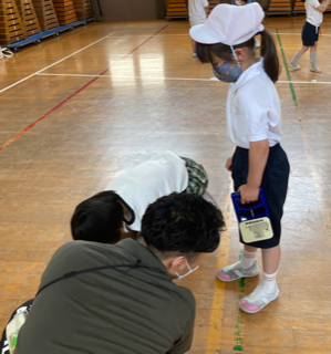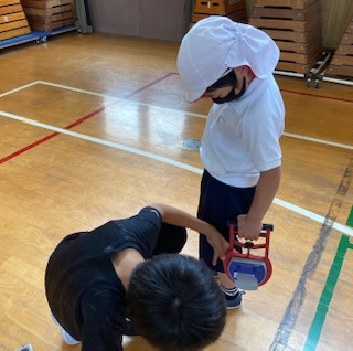 1年生が6年生と一緒に、体力テストの握力を測定しました。6年生に握力の仕方を教えてもらい、記録もしてもらいました。1年生は、声を出して力いっぱい握っていました。