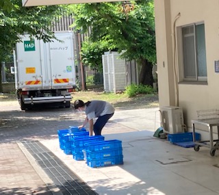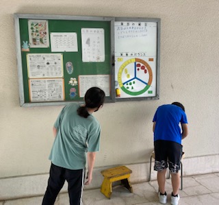 給食委員会の児童は、献立を書き、食材を3色に分けて表示しています。また、牛乳パックを返却しやすいように、牛乳かごとバケツを並べています。いつもご苦労様です。