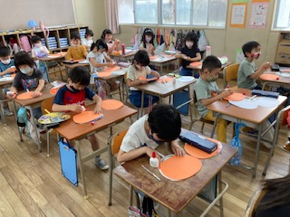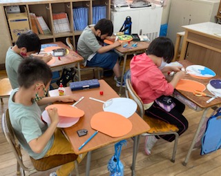 2年生が運動会の団体演技で使う道具を作りました。うちわに画用紙を貼りました。2組はオレンジ色です。