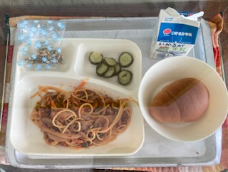 献立は、スパゲッティミートソース、きゅうりのピクルス、アーモンドフィッシュ、ミニこくとうパン、牛乳です。明日6月4日は、「むし歯予防デー」です。好き嫌いしないで、赤、黄、緑のグループの食べ物をバランスよく食べて、じょうぶな歯を作りましょう。