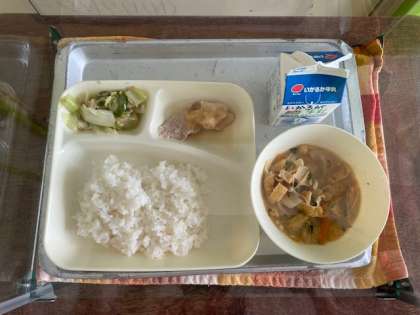 今日の献立は、鶏肉のおろし醤油かけ、野菜炒め、みそ汁、ごはん、牛乳です。
