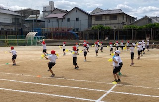 1年生が運動会の団体演技の練習をしました。フリフリの棒を持って楽しく踊っています。