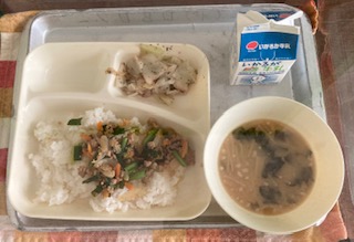 本日の献立は、豚ひき肉とにらのそぼろ丼、みそ汁、キャベツの赤じそあえ、ご飯、牛乳です。