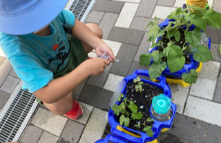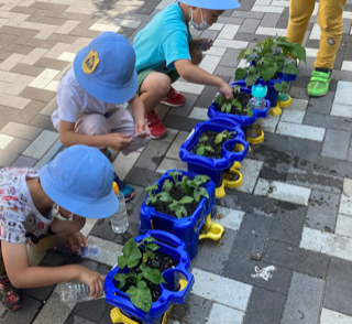 1年生が生活科の学習でアサガオを育てています。本葉が出てきたので、肥料を入れました。