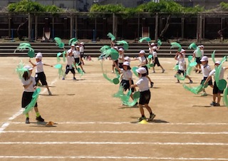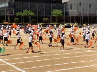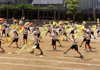 運動会まであと2日となり、団体演技は、仕上げの段階にきています。リズムに乗って楽しく踊っている2年生です。